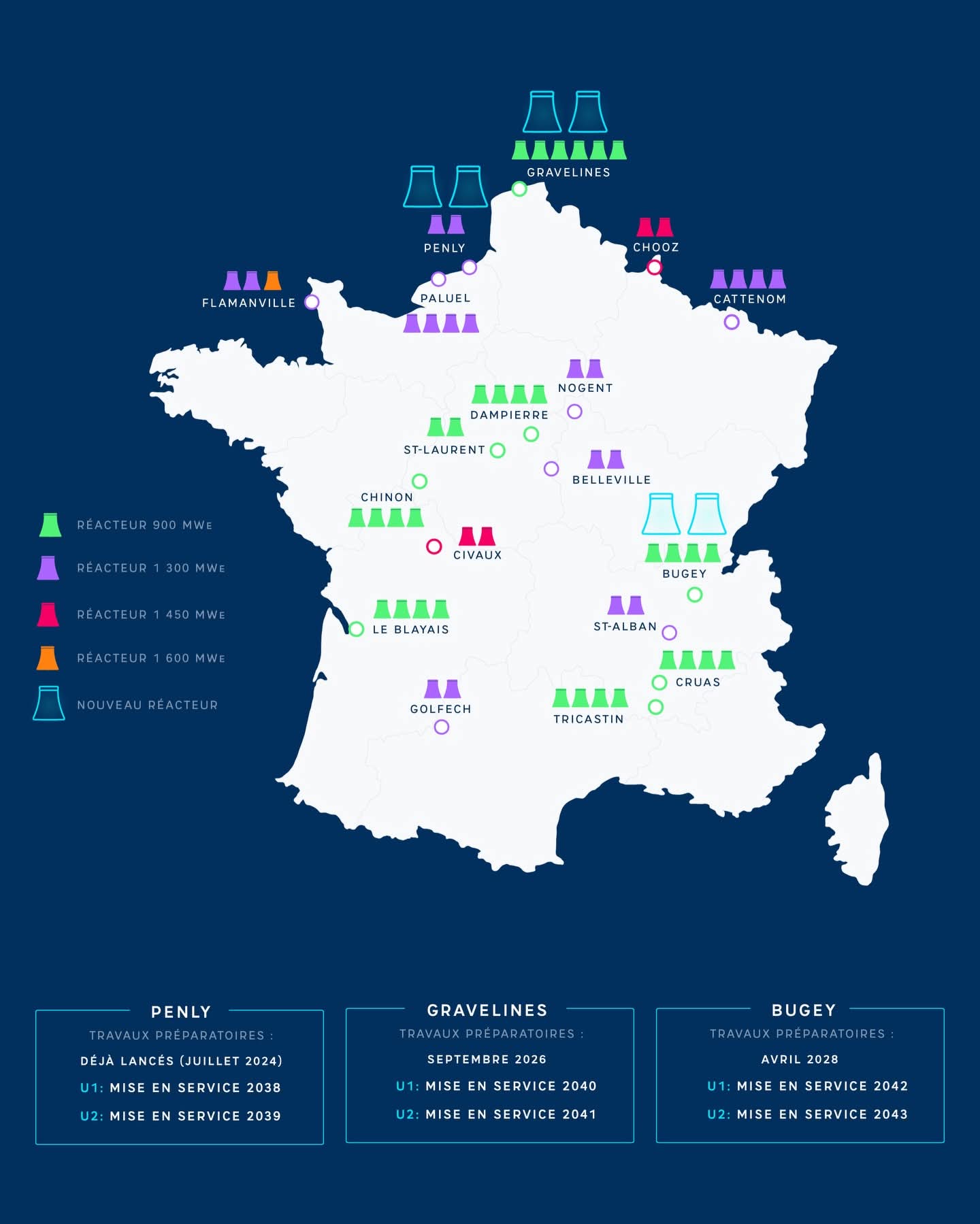 Aujourd’hui, ce cap se concrétise avec le lancement de la construction de six nouveaux réacteurs de type EPR2. Ces installations verront le jour sur les sites de Penly, Gravelines et Bugey, marquant une nouvelle étape dans la modernisation du parc nucléaire français.